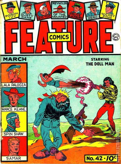 A collection of comics and stories, including "The Treasure of the Black Albatross" , featuring Doll Man : After a mix-up at a pet shop, Darrel Dane revisits the store, only the find the shopkeeper on the floor, beaten to death. Then he meets the guy's lovely daughter Jane, who then asks Dane to be present at the reading of her father's will, which he soon is. The will bequeaths to Jane "the Treasure of the Black Albatross." PLUS : Rance Keane, Zero the Ghost Detective, Poison Ivy, Spin Shaw, and more!!