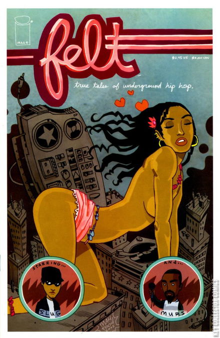 Felt: True Tales of Underground Hip-Hop, Image Comics, May 2005. This is a Collectible Black and White Comic Book. It is written & illustrated by Jim Mahfood cover by Jim Mahfood & Jose Garabaldi. Slug (from the group Atmosphere) and Murs (from Living Legends) are two of the hottest rappers in the underground hip hop scene today. FELT is a one-shot comic that acts as a visual interpretation of their new collaborative album under the same name. But you don't have to buy the new album to dig this book! Popular cartoonist JIM MAHFOOD (CLERKS, STUPID COMICS) turns tunes from the new record into funny and clever comic strips with topics ranging from bar fights, to break-ups, to making art, to dirty girls!
