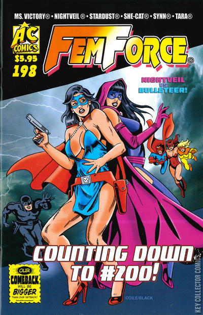 Nightveil's Cloak of Darkness, a cosmic force beyond imagination, is free from control by the sorceress and the wizard, Azagoth. It's first course of action... destroy the Blue Bulleteer! Can Femforce stop this attack and save Laura Wright? Written, inked, and colored by Femforce creator Bill Black!