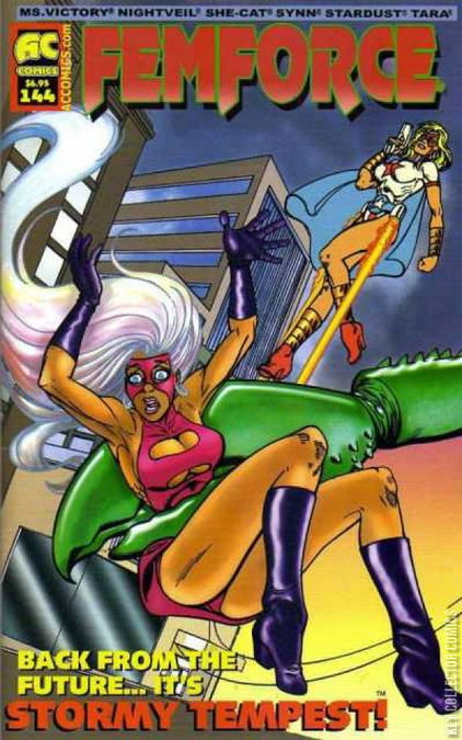 As the tumultuous lives of MS. VICTORY, NIGHTVEIL, SYNN, TARA, SHE-CAT and the rest of the Femforce cast continue to unravel, a new player comes onto the scene- familiar to old-time AC/Paragon readers, but NEW to FEMFORCE faithful. From out of the far-flung future, its the skyfairing adventuress known as STORMY FOSTER, blasting into our present time, bringing destruction in her wake. What is her mysterious mission in our time, and will she meet the FF as friend or foe? Find out in "Storm Warning"