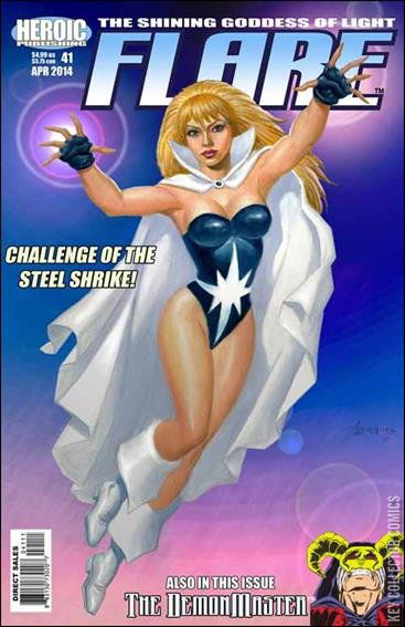 When a Syrian diplomat is killed on American soil, FLARE is called upon to bring the assassin to justice. Never mind the fact that the "victim" was a murderous terrorist-sponsoring Baathist thug who deserved what he got a dozen times over. You don't get away with killing someone who came to this country on a diplomatic visa. And not even a few "friendly" words of warning from the Black Enchantress about not meddling in her affairs is going to deter our glittering goddess of light from doing the job she was asked to do. "The Challenge of the Steel Shrike" is an all-new adventure by Dennis Mallonee and Mark Propst that ties in directly with events in upcoming issues of the League of Champions. Also in this issue: Our SENSATIONAL G-GIRL tie-in continues as the final fate of FLARE's wicked shape-shifting brother, Philip Gottmann is revealed in Chapter Two of "The Fate of the Demonmaster," another all-new adventure by Dennis Mallonee, Denny Fincke, and J. Adam Walters. Cover by Paul Abrams