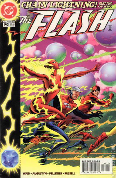 CHAIN LIGHTNING, CHAPTER TWO: TIME LIKE A RIVER ... Wally West, Jay Garrick, Max Mercury, and Jesse Quick run into a variety of speedsters as they travel the time stream looking to save the lives of future Flashes. Each of the speedsters have traveled to another time period to recruit heroes against Cobalt Blue. Jesse Quick had come to the 28th century, and been blasted by that era’s Cobalt Blue. That era’s Flash, Jace Allen, saves her, and the two team up to defeat the female green-skinned Cobalt Blue. Jesse gives Jace a sliver of Cobalt Blue’s gem to Jace before heading off again. In the 853rd century, Wally West stops by to recruit the help of that era’s Flash, John Fox, member of the Justice Legion Alpha. The two Flashes defeat the villain Wetware, Wally gives John a sliver, and the two are off to continue warning speedsters. Max Mercury arrives in the year 2231, where he is not in time to stop the Flash of that era from killing Cobalt Blue. Earlier, that era’s Cobalt Blue crippled that Flash’s daughter. Unfortunate, a nearby teen grabs the mystic gem, becoming the next Cobalt Blue and killing Flash. Max realizes that the gem is what passes the Cobalt Blue dynasty. The teen Cobalt Blue is defeated by Max and the Flash’s daughter, Sela, now powered by the Speed Force. Sela becomes the next Flash, but the curse of Cobalt Blue took its first of two Flashes. Sela and Max continue the recruitment. Meanwhile, Bart finds his next Flash, Jay Garrick finds his next Flash ( Wally’s daughter), and Wally West goes to confront the Reverse-Flash.