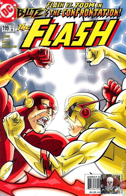 Reprinted in Flash : Blitz (2004)The story begins with Zoom confronting Linda. Impulse arrives to save the day but is easily taken down by the Reverse Flash, who kidnaps Linda.Nearby, the Flash pulls Jay Garrick out of the wreckage of the gym Zoom knocked him into last issue. Zoom arrives with Linda and quickly defeats both Flashes. Zoom mentions that Linda is precious to Wally but that he cannot protect her. She is a target that needs to go away. With a snap of his fingers, the villain creates a sonic boom, injuring the Flash's wife badly. The Flashes take Linda to the hospital, but Zoom shows up again. Jay and Bart give Wally their speed to give Wally a leg up on Zoom. Still just a blur to the Flash's eyes, Zoom attacks, taking...