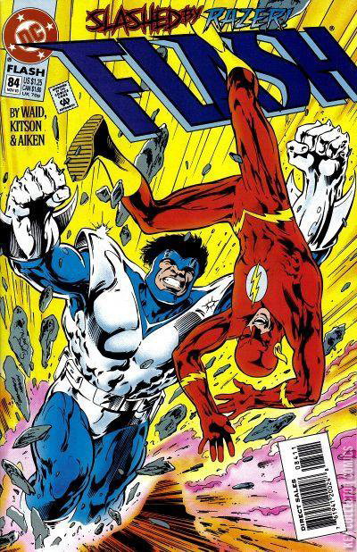 Flash tries to keep Razer from levelling the mall in "Cutting Edge". Part 1 of 2, continued next issue.