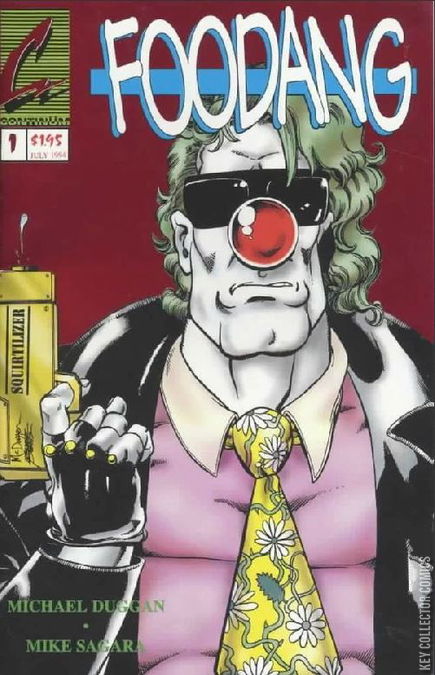 Story and art by Michael Duggan and Mike Sagara. Cardstock red foil cover by Michael Duggan and George Perez. The adventures of Foodang, a superhero whose costume is a clown suit, complete with red rubber nose. Foodang was an ordinary, average man – er, clown, until a freak accident gave him superhuman strength and simultaneously bonded him to the clown's costume he happened to be wearing at the time. Becoming a superhero seemed like the logical choice. Cover art assist by legendary Marvel and DC artist George Perez. Followed by Foodang (1995 August House). 32 pages, Full Color.