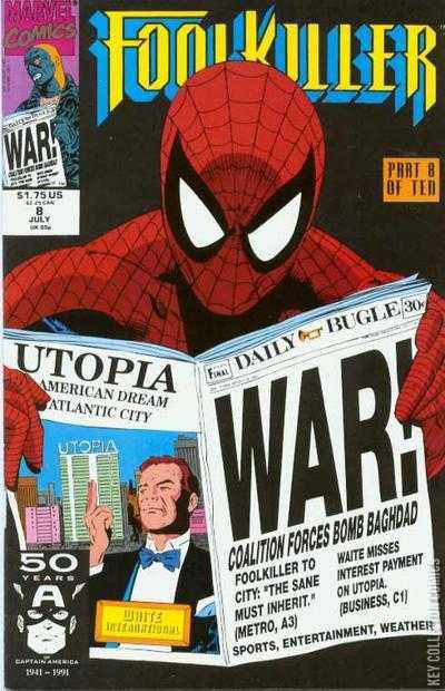 Operation: Desert Storm has just begun. With lines drawn, protesters for and against the war gather in force. When a peace rally escalates into violence, the Fool Killer is on hand, and as we know, he suffers no fools. No matter which side they are on. Plus, an appearance by your friendly neighborhood Spider-Man.The Foolkiller is stumbling under the pressure. He is chasing after Waite, a corrupt businessman. Spider-Man is taking an interest in him. And his definition of fools seems to be changing to include more and more people...
