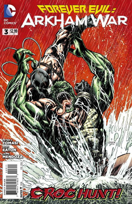 ARKHAM WAR: DAS BAT! In the wake of the Crime Syndicate's attack on the Justice Leagues, Gotham City has been overrun by mercenaries who have made themselves a corrupt and violent police force. This is merely backdrop, though, to the ongoing battle between the two most powerful criminal elements in the city: the inmates of Arkham Asylum versus those of Blackgate Penitentiary. Unfortunately for the former, the latter have found a powerful leader in the Santa Priscan warlord Bane. In order to get an edge over him, the Arkhamites have stolen the Court of Owls' Talons - his secret weapons - from him. Unfortunately, they lost one in the process of their kidnapping. Even so, Mister Freeze is reluctant to bring the assassins back to life, knowing that they are of dubious origin, but with death at the hands of Bane a legitimate threat, they cannot go without the advantage. Among Bane's followers is Ignatius Ogilvy, who once usurped the Penguin's empire. As Bane intends to strike a bargain with the Penguin, who remains neutral in the war, he turns on his own man, and brings Ogilvy in to the self-declared mayor's office, so that Penguin can have vengeance. In exchange, Bane wants back the Talons. Penguin reveals that Scarecrow, who engineered the kidnapping, will soon be back at Wayne Tower, and he is not afraid of Bane. In fact, many of the Arkhamites are not. As such, Bane should be wary of the fact that they think him no Batman. In response, Bane returns to Blackgate, pushing past his allies and underlings to the prison's workshop, where he builds himself a Batsuit. Donning it, he enters the night, and cries out that the Batman lives. Killer Croc, meanwhile, has led his band of sewer-dwellers up into Wayne Tower, promising that if they wish it, he will lead them to victory over both of the warring factions as their king. The people cheer, but their cheering is silenced by Bane, crashing through the glass windows. Brutally, they beat each other until, at last, Bane summons the strength to raise his victim over his head, and throw him from the tower. Assuming that Croc is dead, Bane subjugates the creature's followers and prepares for his mission to take back the Talons.