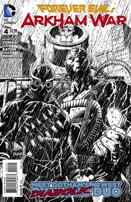 ARKHAM WAR: EMPIRE OF THE BAT Finally in possession of a Talon, Bane first wakes William Cobb. The former assassin for the Court of Owls is not unfamiliar with Bane's name, and so Bane is pleased to offer him a chance to join him in making a Gotham City-gone-wrong right. While Blackgate is his, the Arkham Asylum inmates have carved out the rest of Gotham into fiefdoms, and they have also taken the remaining Talons. Cobb wants them freed - and that desire allies with Bane's own. Meanwhile, the Arkhamites are split between infighting amongst themselves, and against the escaped Blackgate prisoners loyal to Bane. It is into this fray that Bane unleashes Cobb, who begins cutting and slicing his way through the inmates, explaining that Amadeus Arkham's asylum was always a bad idea in the eyes of the Court of Owls. Lunacy cannot be rehabilitated - only extinguished. In the meantime, Bane has found what he came for, and calls Cobb away to do continue his plan. The pair intervene - with extreme force - as a thug tries to steal bread from a young scavenger, declaring themselves saviors and promising protection. Everyone who seeks aid will find it at Bane Tower, which will be a safe-haven from Arkham's insanity until he is finished crushing it. Until then, though, they will be trained to guard Gotham for themselves, so that they never scream in fear again. Cobb points out that if Bane intends to save the city in order to rule it, the Court will come for him. Bane explains that his plan is first to get the location of the Scarecrow from the captive Mr. Zsasz, and thereby the location of the Talons. Once he has gained control of the city, he will willingly relinquish it to the Court, and in return, they must give him a battalion of Venom-boosted Talons of his own. And from there, he will take the rest of the world. Meanwhile, Scarecrow and his men are nearly finished preparing the Talons to become mind-controlled soldiers for their cause. When that preparation is complete, their first act will be to point them at Bane.
