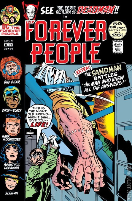 "Doc" Gideon steals one of Serafan's capsules to use it to re-animate a corpse made of assorted body parts; Deadman turns up at a séance and contacts the Forever People. Also featuring Adventure Comics #74 with Sandman, pencils by Jack Kirby. The Man Who Knew All the Answers!, script and pencils by Jack Kirby; Sandman and Sandy face the threat of a scientist who has invented a machine whose revitalizing vibrations allow a man to develop his unused brain cells, tripling his thinking power!