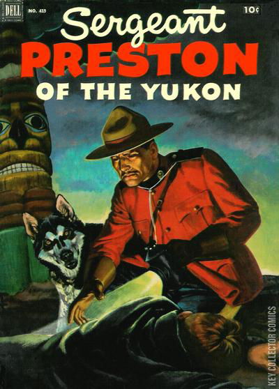 Indicia title is "SERGEANT PRESTON OF THE YUKON, No. 419. Sergeant Preston and the Mutiny's Survivor; The two survivors of a ship's mutiny, each thinking the other is dead, cross paths at a dance hall in Dawson; Baxter, the ringleader of the mutiny, stabs Donahue, who hadn't participated in the mutiny, in order to eliminate the last witness; Yukon King brings Sgt. Preston to save the stabbed man; The next day Donahue tells his story to Sgt. Preston, who then tracks down Baxter. Golconda Claim; Sgt. Preston breaks up a quarrel between two cantankerous old sourdoughs; One claims the other sold him worthless stock in the Golconda Mine. Sergeant Preston and the Printed Tip-Off; A small gang, headed by "Stony" Logan, is terrorizing the Whitehorse District and the newspaper editor prints an editorial demanding action by the Mounted Police. Scripts by Gaylord Du Bois, art by Alberto Giolitti. 36 pages, full color. Cover price $0.10.