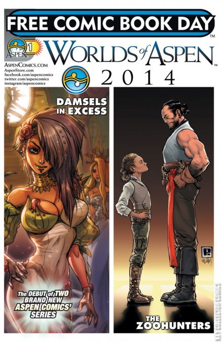 Aspen's popular zero issues return, and only in this exclusive Free Comic Book Day issue featuring two all new stories by Aspen's finest! Vince Hernandez, creator of Charismagic and Trish Out of Water, offers his latest creation, the upcoming fairy-tale adventure series Damsels in Excess, along with brilliant series artist Mirka Andolfo (Trish Out of Water) in this special zero issue prelude--just in time for its summer release! Then, superstar colorist and creator Peter Steigerwald (Fathom, Soulfire), takes a journey into the furthest reaches of the universe in his first all-new Aspen series, The ZooHunters! Coming this fall, this new action-adventure series will redefine what it means to voyage beyond your wildest imagination! Get an exclusive first look with these thrilling zero issues, only available in Worlds of Aspen 2014!