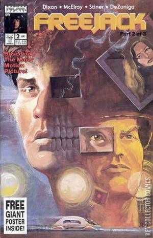 Story by Chuck Dixon and Clint McElroy. Art by Ernie Stiner and Tony DeZuniga. Cover by Max Siebel. One of the many adaptations of movies and TV shows from Now Comics. Based on the 1992 science fiction thriller starring Emilio Estevez, Mick Jagger and Anthony Hopkins. Escaping his futuristic captors, Alex becomes a freejack, or rogue time-traveler, and goes in search of the one person who might help him: the woman who loved him 20 years before.