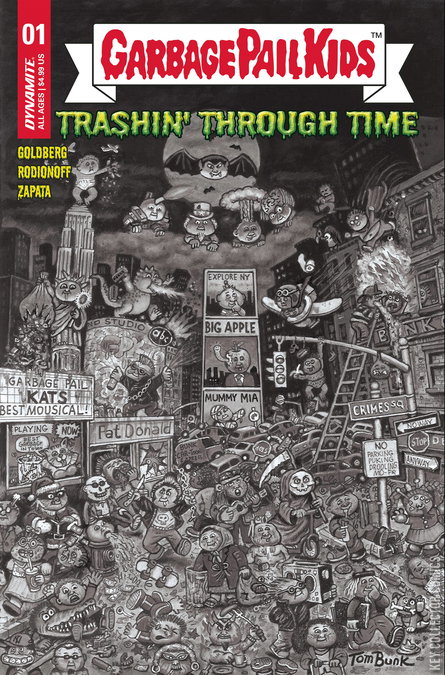 'The unhinged trio of ADAM F. GOLDBERG, HANS RODIONOFF, and JEFF ZAPATA have rejoined forces with Dynamite Entertainment to continue their saga of the outrageous origins of the Garbage Pail Kids as they go Trashin' Through Time! Jumping from the days of World War II at the end of GPK: Origins, our heroes find themselves transported to the 1980s - where Garbage Pail Kids rule the world! That's right, the Garbage Pail Kids are now the dominant species on Earth, and normal humans have been subjugated and forced to live as outcasts from society. It's the Planet of the Garbage Pail Kids - and we just live on it! Garbage Pail Kids: Trashin' Through Time #1 also features covers showcasing four incredible artists: TOM BUNK, JEFF ZAPATA, and CHRIS MEEKS, along with a classic GPK trading card image by DUSTIN GRAHAM. And best of all, every version comes polybagged with a special GPK: ORIGINS trading card created exclusively for Dynamite and officially approved by Topps! '