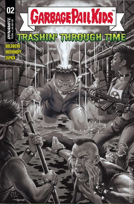 Our heroes have been transported through time to the 1980s, where the Garbage Pail Kids are the Earth's dominant species and normal humans have become outcasts from society. Return to the Planet of the Garbage Pail Kids as we continue 'Trashin' Through Time!' In this issue: Adam and his GPKommandos are Nasty Nick's prisoners and there's no way out! That is, until T.R.A.S.H. - Team of Rebels Assigned to Save Humankind - arrives on the scene! Now, our heroes must find a way back in time to stop Nasty Nick in the first place… what could go wrong!?! This historic second issues features four incredible cardstock covers - including art by the legendary Ray Lago, along with Jeff Zapata, Dustin Graham, and a classic GPK Trading Card image - and every copy is polybagged with a special GPK Trading Card created exclusively for Dynamite and officially approved by Topps!
