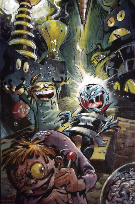 The insane minds of Adam F. Goldberg, Hans Rodionoff, and Jeff Zapata continue to rummage through the ash heap of history in Garbage Pail Kids: Trashin' Through Time #3! In this issue, Adam Bomb leads a daring raid on the Topps Gum Headquarters. Then, with a stale gum machine in tow, the GPKommandos head back in time to Romania in the 1800s, where we are treated to the origin story of Nasty Nick! You don't want to miss it! This triumphant title boasts cardstock covers featuring four fantastic artists - including Tom Bunk, Jeff Zapata, Lowell Isaac, and a classic GPK Trading Card image - and every copy is polybagged with a special GPK Trading Card created exclusively for Dynamite and officially approved by Topps!