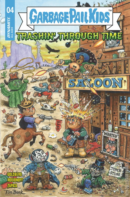 The insane minds of Adam F. Goldberg, Hans Rodionoff, and Jeff Zapata continue their ransacking of your childhood in Garbage Pail Kids: Trashin' Through Time #4! In this issue: The Kommandos chase Nasty Nick across history - through prehistoric times, ancient Greece, the days of Prohibition, the Old West, and more - and they meet many a classic GPK character along the way! The ride comes to an end in the future, though, where we catch a glimpse of� oh crap, are those zombies!?! Featuring four incredible cardstock covers boasting art by Jeff Zapata, Tom Bunk, David Ascevedo, and a classic GPK Trading Card image, every copy of Garbage Pail Kids: Trashin' Through Time #4 is polybagged with a special GPK Trading Card created exclusively for Dynamite and officially approved by Topps!