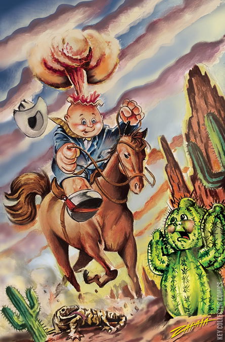 The insane minds of Adam F. Goldberg, Hans Rodionoff, and Jeff Zapata continue their ransacking of your childhood in Garbage Pail Kids: Trashin' Through Time #4! In this issue: The Kommandos chase Nasty Nick across history - through prehistoric times, ancient Greece, the days of Prohibition, the Old West, and more - and they meet many a classic GPK character along the way! The ride comes to an end in the future, though, where we catch a glimpse of� oh crap, are those zombies!?! Featuring four incredible cardstock covers boasting art by Jeff Zapata, Tom Bunk, David Ascevedo, and a classic GPK Trading Card image, every copy of Garbage Pail Kids: Trashin' Through Time #4 is polybagged with a special GPK Trading Card created exclusively for Dynamite and officially approved by Topps!