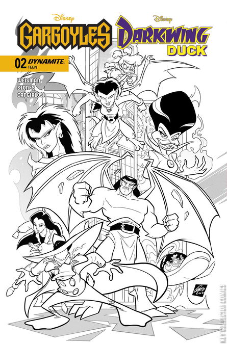 DEMONA WILL MAKE SURE THIS CAGED DUCK SINGS! The creators of the original Gargoyles and Darkwing Duck animated series return for the second installment of their hotly anticipated comics crossover adventure! With Darkwing’s magical amour Morgana Macawber now in Demona’s clutches, it’s a race against time for the Terror That Flaps in the Night to locate the two sorceresses before Morgana is coerced into revealing the location of the sinister spell book known as the Quackronomicon — and thus handing Demona the keys to world domination! But DW won’t get far without Elisa and Goliath’s help — and the head of the Manhattan Clan is down for the count until sunset. With half a day of downtime to contend with, can this unlikely trio of heroes crack the case before Morgana cracks under Demona’s interrogation? And while we’re on the subject, what have Launchpad and Gosalyn been doing all this time? The answers to these and many more burning questions will be revealed in the portent-filled pages of Gargoyles/Darkwing Duck #2 — crafted by tandem authors GREG WEISMAN and TAD STONES and artist CIRO CANGIALOSI, and enriched by hand-carved covers from STONES, CANGIALOSI, CLAYTON HENRY, and IVAN BIGARELLA!