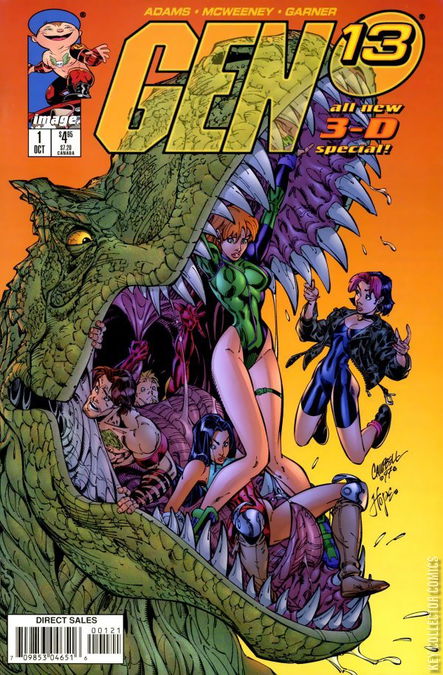 A double dose of brand new stories created especially for 3-D. In the first, by Art Adams, Gen13, on a field trip to Portland, run afoul of their, ahem, old nemesis... Baby Luv. They must save the day from his monstrous Robo-Rex, a twenty foot tall robotic T-Rex, and still meet Mr. Lynch for dinner! Tom McWeeney slam dunks the second story, "Lab Brats"—a humorous look at half-pint versions of our heroes as if they were raised in the confines of I.O. Glasses included!