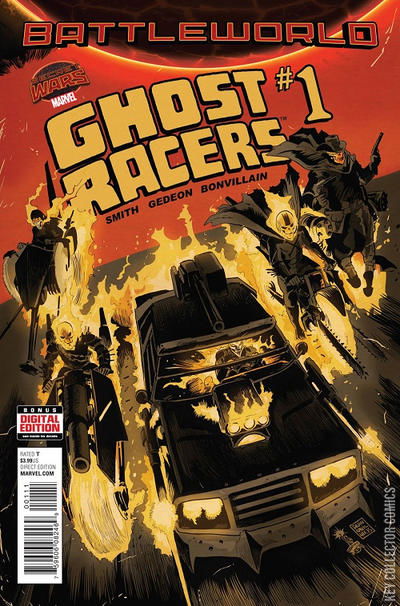 FURIOUS RACE FROM HELL IN A BLAZING ARENA OF HORROR!!! Welcome to the scorching-hot track where cursed souls race at the speed of sin, anything and everything goes and the only rule is no rule--it's the spectacle known as the GHOST RACES; the most hellish 'entertainment' known to BATTLEWORLD! 1st place prize: Temporary freedom from the ARENA, but what happens to the unlucky and unholy losers? It's all-out, high-speed warfare among the most bizarre and vicious GHOST RIDERS of the MARVEL UNIVERSE. Expect MANY familiar SKULLS!! SECRET WARS TIE-IN