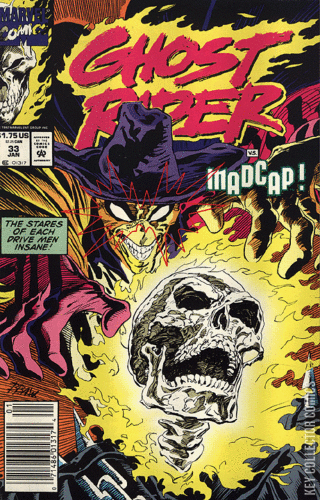 WHAT DOES IT MATTER?! Danny Ketch reflects on how his life has changed since becoming Ghost Rider, until his mother interrupts him. Blackout's recent attack has made her consider the possibility of losing him, prompting her to admit something she never had the courage to tell him before: He and Barbara were adopted. Not sure what to think, Dan goes out for some air. Meanwhile, the Firm raids HEART's HQ, killing all the mercenaries except Meagher, who they take prisoner. Elsewhere, the insane Madcap, unable to feel pain since the accident that killed his family and mutated him, decides to show others that life is meaningless. Going to Grand Central Station, he uses his lunacy – introducing gazes to send several bystanders on reckless, life-threatening rampages. Driving by, Danny witnesses one victim's death, triggering his transformation; he catches Madcap, and deploys the penance stare, making Madcap feel pain for the first time since his accident. However, after he departs, Madcap recovers, overjoyed at feeling the long-lost sensation, and desperate to experience it again, no matter how much innocent blood he needs to spill to do so. Dan returns home, deciding to find his birth parents, convinced they must somehow be tied to Ghost Rider. NOTE: The letters page of this issue includes an illustration of Ghost Rider mourning the then-recent demise of DC Comics Superman, and promising to seek vengeance for him.
