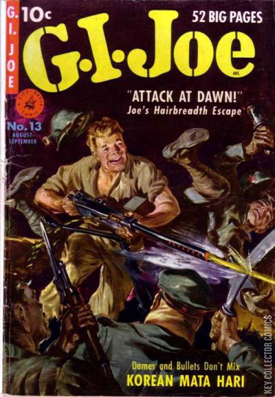 Home / Ziff-Davis / G.I. Joe / G.I. Joe #13 Ziff-Davis Released September 1951 G.I. Joe #13 Add to Collection Want It Synopsis No synopsis available. Issue 4 of 5 Add to Collection Buy it on eBay Buy on eBay Low $25 Mid $75 High $250 Synopsis No synopsis available. Details Series G.I. Joe Cover Date September 1951 Pages 52 UPC N/A Cover Price $0.10 Final Order Cutoff N/A Creators No creators listed. Price Guide Log in or subscribe to access detailed graded price information and market insights. Log In Subscribe