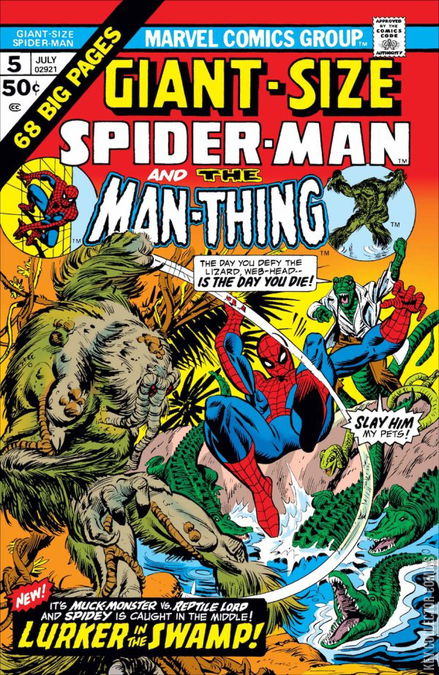 BEWARE THE PATH OF THE MONSTER! While web-slinging through the city, Spider-Man realizes that he needs to get away from New York, and sort out the state of his life. He happens to see a news reports concerning the Man-Thing's activities in Florida, and decides to try and convince J. Jonah Jameson to send Peter Parker out to Florida to try and get pictures of the monster. After convincing Jameson, Peter calls his old friend Dr. Curt Connors, who agrees to to help him out, since he lives in Florida. Next, Peter calls Mary Jane, who is excited that he's called her, but disappointed when he tells her he's leaving town for a few days. She quickly hides this disappointment when her Aunt Anna enters the room. Meanwhile in Florida, Curt Connors accidentally knocks over a beaker containing a chemical mixture, the gas from which causes him to once more turn into The Lizard. He attacks Connors's wife, before returning to the swamps. Once there, the Lizard rants about making lizards the dominant life form on the planet. Upon seeing the Man-Thing, he realizes the creature poses a threat to his plans. Before leaving New York for Florida, Peter pays a visit to Gwen Stacy, and apologizes for his behavior following her sudden "resurrection". Meanwhile in Florida, Edmond Arnstead, a down-and-out bio-chemist who has become bankrupt due to the recent recession, has come to the swamps in order to commit suicide. Before he can do that, he is saved by the Man-Thing, the bog-beast being attracted to his emotions and the arrival of a huge alligator. Realizing that he's discovered the location of the Man-Thing, Arnstead realizes the money making potential and leaves the scene via his car. Elsewhere, Spider-Man has finally reached Florida, but before he can arrive at the Connors home, he's suddenly attacked by The Lizard. However, with Martha Connors's help, Spider-Man is able to gain the upper hand against the creature and bind him with his webbing. With the Lizard incapacitated, they debate on how best to deal with him. Elsewhere in the swamp, Edmond has been tracking the Man-Thing, figuring that if he can somehow capture it, he can make money off the creature. He follows the bog-beast, as it and various lizards are drawn to The Lizard's mental commands for aid. When the various amphibious creatures and the Man-Thing arrive on the Connors property, Spider-Man mistakenly attacks the Man-Thing, while the lizards free The Lizard. When Spider-Man realizes what's really going on, he attacks The Lizard, with an assist from the Man-Thing. Meanwhile, after Edmond is informed that Connors and The Lizard are one and the same, he has the Doctor's wife take him to the lab, where Edmond uses his scientific knowledge to come up with a cure. Upon arriving in the middle of the battle, Edmond almost drops the cure, but Spider-Man saves it from a spill with his webbing and proceeds to use it on the Lizard, who transforms back into Curt Connors. With the mental control gone, the various lizards and the Man-Thing return to the swamp. Edmond tells all present that until he met the Man-Thing he figured his life was over, but now has given things a second thought and is going to give life a second chance. WHERE FLIES THE BEETLE...! Reprint of Amazing Spider-Man #21