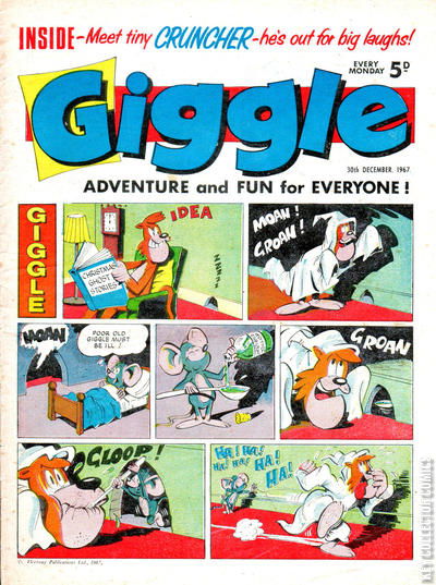 Home / IPC Magazines / Giggle / Giggle #30 December 1967 IPC Magazines Released {{ issue.publishedDate|to_date|date:'F Y' }} Giggle #30 December 1967 Add to Collection Want It Synopsis No synopsis available. Add to Collection Buy it on eBay Buy on eBay Low $5 Mid {{ issue.priceMedium | price }} High $50 Synopsis No synopsis available. Details Series Giggle Cover Date December 1967 Pages N/A UPC N/A Cover Price N/A Final Order Cutoff N/A Creators No creators listed. Price Guide Log in or subscribe to access detailed graded price information and market insights. Log In Subscribe
