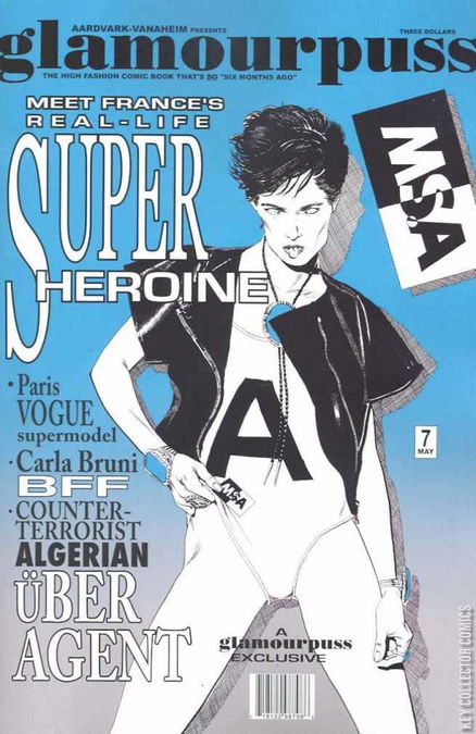 Because glamourpuss is still in rehab, Dave Sim needed something to fill the 'glamour' half of the book and chose Super-Heroines! Including France's real-life supermodel/Super-Heroine, Ms A, who was born on Steve Ditko's 60th birthday and is counter-terrorism uber agent for the Sarkozy government, plus Leather Cleavage! Girl Flash (aka Top Notch)! Flower Bomb! Veiled Threat! and Puppy High 5! Which glamourpuss Super-Heroine most deserves her own Aardvark-Vanaheim mini-series? Voting details included on the inside front cover. The photorealism in comics section continues the examination of the arrival of Stan Drake in the early 50's.