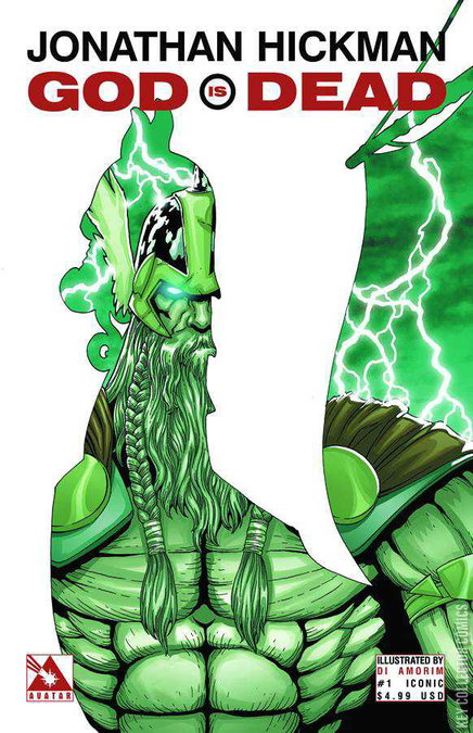 DEUS. REX. TERRA. Like a thunderbolt from heaven, the epic launch issue of GOD IS DEAD is here! East of West and Fantastic Four author JONATHAN HICKMAN launches a fierce new series that stomps where others fear to tread. Mankind has argued over the existence of gods since the dawn of time. In modern eras it's been fashionable to mock religious believers with taunts of scientific testimony and fact. But when the gods of old begin to reappear on earth and claim the domain of man for their own, the world is thrown into a state of utter anarchy. Now Horus walks the streets of Egypt, Zeus has taken over the Sistine Chapel, and Odin is coordinating the dissection of the earth among the returned deities. Mankind held sway over the world for thousands of years and their hubris over that time has made them powerful but when faced with the divine, can mortal weapons put an end to the second coming of the gods? Available with a Regular cover by Jonathan Hickman, End of Days cover by super-star Jacen Burrows, a premium Iconic cover by Burrows that features a card stock cover and is limited to just 5000 copies, and a Pantheon Order Incentive cover by series artist Di Amorim.