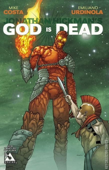 The Titans have been released upon a war ravaged world. Now giant beings and beasts threaten to turn the planet into a blazing ruin. The bickering gods have no choice but to unite in the face of certain destruction. But can their temporary truce last long enough to defeat the Titans or will the temptation to turn upon each other be too great to pass up? Don't miss the epic new direction for God Is Dead! Available with a Regular, End of Days, and Gilded Retailer Incentive covers by Jacen Burrows, a Carnage Wraparound cover by German Nobile, an Iconic by Facundo Percio, and a special Enchanting cover by Gardenio Lima.
