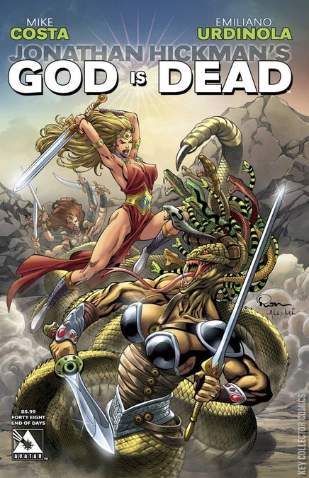 The end is nigh! This is the way the World ends... and the series! This 64 page issue is the powerful final issue of God is Dead and Mike Costa has held nothing back. If you thought things could not be worse for this deity ravaged world, you need to see what insane twists and turn this grand finale takes. We further celebrate this epic series with an amazing cover gallery by German Nobile! Available with Regular Cover by Jacen Burrows, Enchanting, Iconic Covers, End of Days and Gilded covers by Ron Adrian, and a special 2-part Connecting Wraparound Covers by German Nobile with every character from the series!