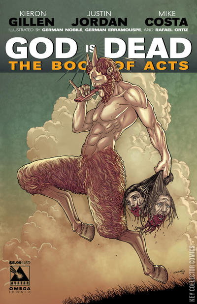 The greatest assembled team of writers unleash all-new tales of Gods and men in the biggest event of the summer! KIERON GILLEN unveils Alastor, the demon assassin who sees nothing but opportunity in the new order of things. While Gods are away, the demonic can play... JUSTIN JORDAN unleashes a pitch-black tale of evil as Pan decides to mix with mortals. And don't miss the second part of the greatest murder mystery in the pantheons as MIKE COSTA finally solves the mystery of who killed God! The Alpha and the Omega, two epic tomes that you don't want to miss! Available with lovely Regular, Iconic, and End of Days covers by series cover artist Jacen Burrows. Also a Carnage Wraparound by German Nobile and Divine and Pure Art Retailer Incentives by Burrows.