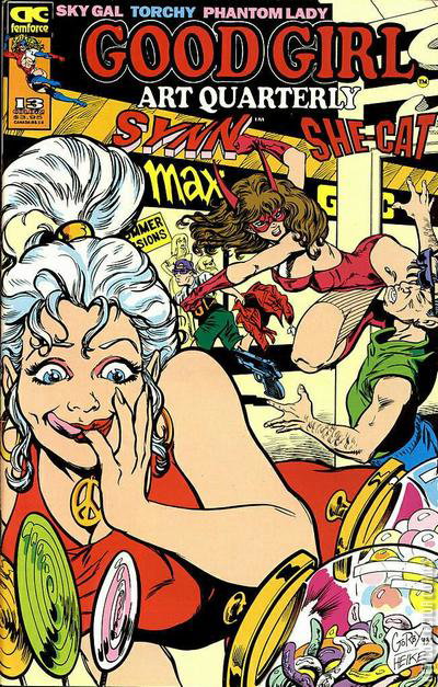 In response to the bad-girl art trend, AC Comics reprints classic good-girl stories that originally appeared in Golden Age comics, along with some new ones. She-Cat and Synn encounter thieves at the mall during their day off; classic Matt Baker Phantom Lady and Sky Girl stories; an overview of female supporting characters of Golden Age comics. Plus photos of AC spokesmodels at the 1993 San Diego Comic-Con. Synn and She-Cat: Shopping Maul; Sky Gal: What's Buzzing; AC Fem Gals at the San Diego Con; Who Is Star Pirate?; Window Dressing; Phantom Lady: Ghosts, Galleons and Gold; Torchy.