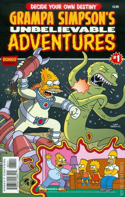 A One-Shot Wonder unlike any that has gone before! Join Grampa Simpson as he takes you on an unbelievable tale of swashbuckling derring-do that spans the entire cosmos! It's the wildest ride Bongo Comics has ever offered. And best of all, you take the story wherever you want to go! The possibilities are endless and the options inexhaustible. You can't go wrong when you choose Grampa Simpson's 'Choose Your Own Adventure' Adventure!