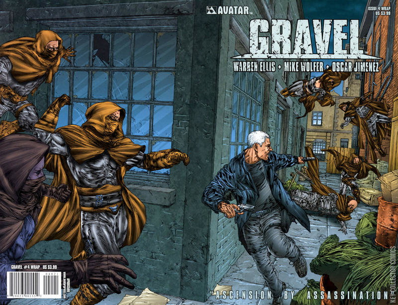 Gravel, the explosive monthly series from Ellis and Wolfer, dials up the action with this all combat magic issue! William Gravel has had a busy week -- hunting down and disposing of his former co-workers one after the next, to relieve them of their peices of the hideously powerful Sigsand Manuscript. Killing magicians is tiring work, and Gravel would much prefer to relax with a nice pint, but it looks like he's going to have to deal with yet another adversary, and what's worse, this one has not arrived alone. Edwin Royston has brought with him his nine acolytes, an assemblage of young magicians who are ready to serve under him once he has finished what Gravel started: eradicating the remainder of the Minor Seven, Britain's greatest Occult Magicians. Near exhaustion, hopelessly outnumbered, and low on bullets, Gravel will have to dig into his deepest supernatural reserves to make it though this night alive... And if he manages to outlive the acolytes, he'll still have to battle Royston to the death to determine the owner of the fourth section of the Sigsand! This issue is available with a regular cover by Mike Wolfer, a wraparound by new series artist Oscar Jimenez, and also a rare 1-in-15 Black Magic Edition featuring a new cover by Wolfer.