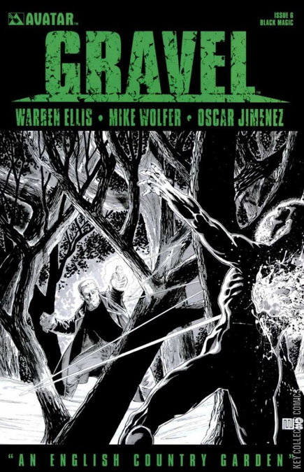 Gravel, the explosive monthly series from Ellis and Wolfer, continues to slam through the competition with it's vicious, bloody run! In his violent search for the six pieces of an ancient text of unimaginable supernatural power, Sergeant Major William Gravel has left the mangled corpses of 14 fellow magicians and Occult Detectives in his wake. Bruised, torn, beaten and cut beyond even super-normal endurance, Gravel would like nothing more than to enjoy the spoils of his victory. What's a bloke got to do before he can get some rest and have a nice breakfast at the country estate of one of the men he murdered? Bill should know better - every victory has an unexpected price. Much to his dismay, Gravel has also inherited the mantle of mentor to dozens of magicians-in-training - acolytes who are now leaderless - because Gravel killed their master! The final two pieces of the Sigsand Manuscript are still in the possession of his most powerful opponents, and it's time for Gravel to call in some favors as he prepares for all-out war. There are, of course, worse things to have at his disposal than a score of magic-wielding assassins to blindly follow him into battle! This issue is available with a regular and wraparound cover by Mike Wolfer, and also a rare 1-in-15 Black Magic Edition featuring a new cover by Wolfer.