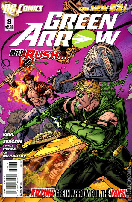 GREEN ARROW'S LAST STAND The Jersey Shore of super villains crashes Seattle to stream Green Arrow's death over the Internet! It's the final fight between Green Arrow and Rush: media maven vs. media star! The whole world's watching on their QPhones and QPads. Why aren't you? Plus: Queen Industries launches their new initiative - and issues a challenge to the world!