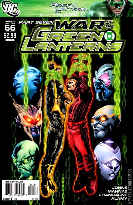 WAR OF THE GREEN LANTERNS, PART 7 The blockbuster "War of the Green Lanterns" takes it toll! Hal Jordan, Guy Gardner, John Stewart and Kyle Rayner fight on against their fellow Lanterns—and the carnage escalates to savage heights. And how will the other New Guardians capitalize on it? CONTINUED IN GREEN LANTERN CORPS #60 .