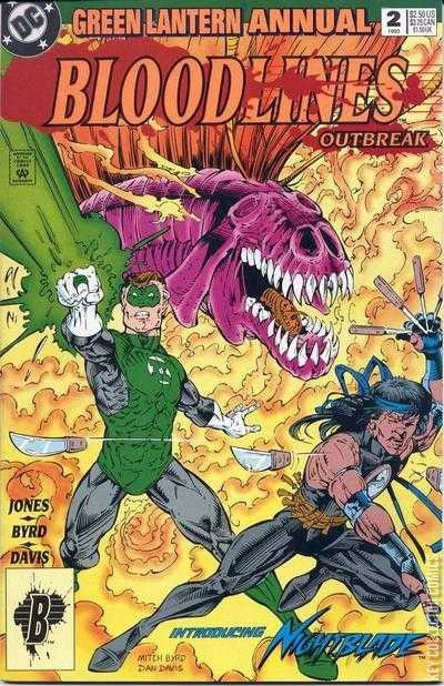 BLOODLINE: OUTBREAK PART 7 - WHERE THE BOYS ARE Continued from Superman Annual #5 Green Lantern returns to Coast City to the site of a slaughter that's left much of the population paranoid, dead or transformed into unstoppable monsters...with only the mysterious young man known as Nightblade standing up to this terrifying plague! Impervious to pain, able to instantly heal any wound and to throw any object with pin-point accuracy, Nightblade is this Annual's infusion of New Blood in to the DC Universe. Continues in Batman Annual #17