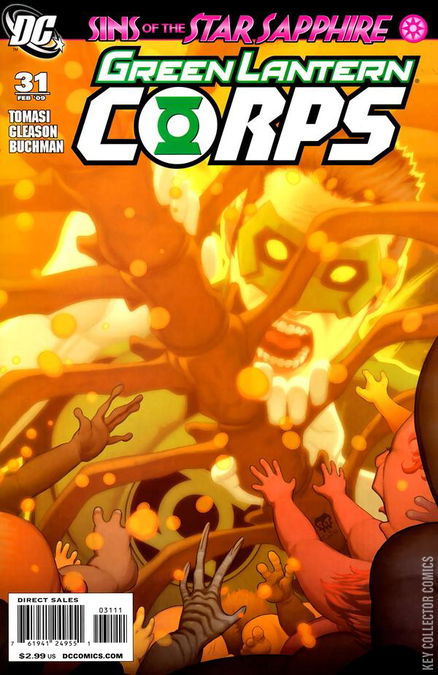 SINS OF THE STAR SAPPHIRE, PART THREE: EMPTY-HANDED HEART A prelude to "Blackest Night" chapter! As the growing power of the Star Sapphires intensifies, the next law is burned into the Book Of Oa by the Guardians resulting in further life-altering reverberations amongst the personal lives of the Corps. Meanwhile Kyle and Natu battle Kryb for the soul of Lantern Amnee and Matoo's infant son.