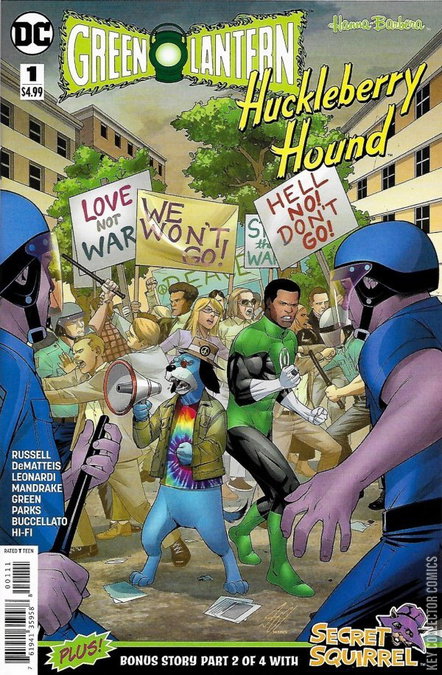 Set against the turbulent backdrop of the early 1970s, Green Lantern and Huckleberry Hound join forces to take a stand on the issues of that era. Returning from recent duty in Vietnam, veteran Marine John Stewart—now a member of the Green Lantern Corps—contemplates what, if anything, he should do about the issues tearing his country apart. Meanwhile, Huckleberry’s comments against the Vietnam war have left him a celebrity outcast, and a visit back home to Mississippi puts him face to face with the Civil Rights Movement. What can one man—and one hound—do? Plus, part two of a Secret Squirrel backup story written by J.M. DeMatteis.