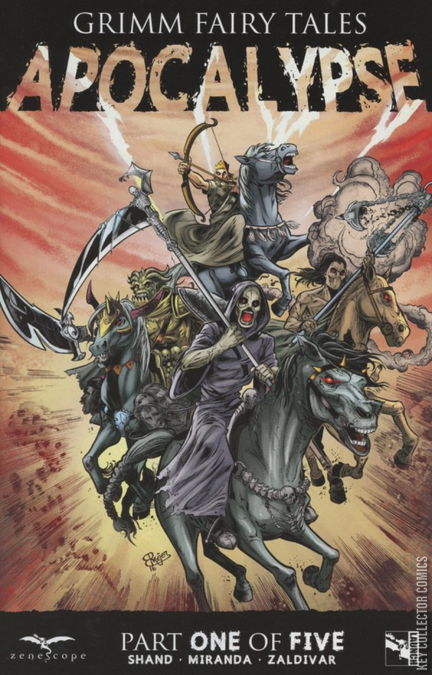 THE FOUR HORSEMEN! NEW SERIES! FEATURES: Robyn Hood, Hellchild, Cinderella, Marian Quin! The casts of Zenescope's flagship series - Grimm Fairy Tales, Robyn Hood, and Hellchild - unite for an event to end all comic book events, the apocalypse. One year ago, Robyn Hood and Marian Quin united to imprison the Four Horsemen underneath New York City, preventing the apocalypse. Now, faced with the return of these unstoppable, immortal demons, Robyn had a choice: sacrifice the world, or her soul.