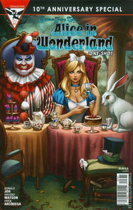 The third of six special 2015 Zenescope 10th Anniversary One-Shots is here. When Alice befriends a boy during her imprisonment in Wonderland, will the madness of the mysterious realm destroy them both or will their friendship keep them from losing their sanity? Return to a Wonderland unlike one you've seen before and watch as Alice's adventures turn into her worst nightmares.