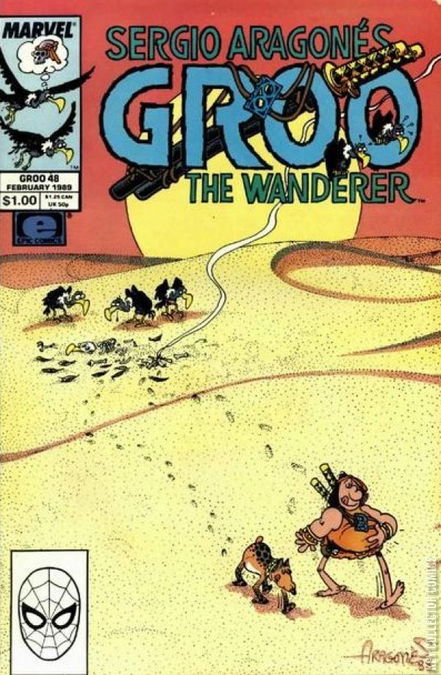 Comic featuring the humorous misadventures of the mighty (physically) but not-so-great (mentally) warrior named Groo. This issue features "The Wanderer!" in which Groo, fed up with how everyone reacts to him, journeys far to seek a land where his reputation does NOT precede him. Story and art credits: Sergio Aragones.