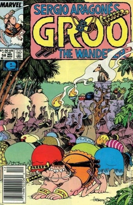 Comic featuring the humorous misadventures of the mighty but not-so-great (mentally) warrior named Groo. This issue features "The Idol" in which Groo's dog Rufferto becomes a tribe's god. Letter column lists the locations of the "Hidden Message" in issues 44 through 55. Story and art credits: Sergio Aragonés.