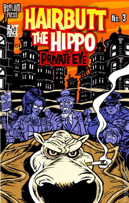 Hairbutt the Hippo stars an anthropomorphic hippopotamus named Hairbutt, who works as a private detective. This issue tells a two-fisted tale of crime noir fiction entitled "TRUST". Brought to you by the decidedly-twisted good folks at Rat Race Comix m Bodine Amerikah and Jason Paulos. Here comes the thundering saga of a Down Under private dick who does not go gently into that good night. You know him, you love him! Yes, it's HAIRBUTT THE HIPPO, he of the nasty temperament and even nastier personal grooming habits. Like one of the covers boasts, "Uncut! Uncensored! Unashamed! Unhygenic!"