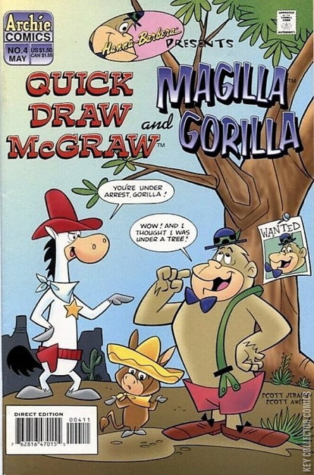 Cover pencils by Scott Jeralds , inks by Scott Awley. Legend of the Lost Monkey Mine, script by Bill Matheny and Laren Bright, pencils by Bill White, inks by James; Magilla Gorilla is sold to a gold mining camp out West. The Good, the Brat, and the Ugly starring Quick Draw McGraw, script by Bill Matheny and Laren Bright, pencils by Bill White, inks by Ruth Leon. The Most Wanted Ape in the West, script by Bill Matheny and Laren Bright, pencils by Bill White, inks by Ruth Leon; Quick Draw and Magilla team up for the first time; In a case of mistaken identity, Magilla ends up as a desperado in Quick Draw's jail. 36 pgs., full color. $1.50.