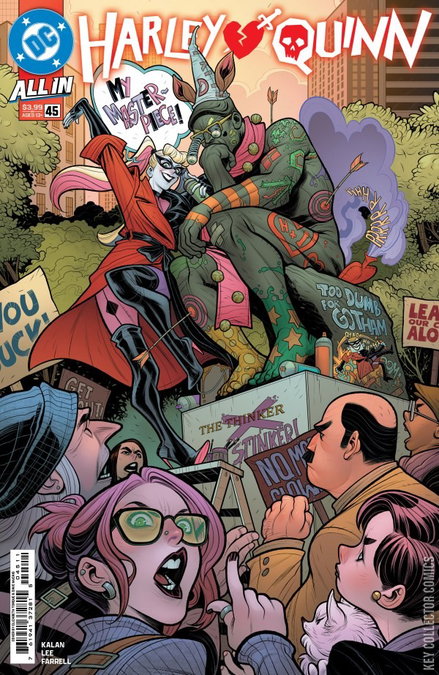 ATTENTION RESIDENTS OF THROATCUTTER HILL! Art! Since the dawn of humanity, we have found emotional, spiritual, and even intellectual meaning through the visual arts. But sometimes...even art can suck real, real bad. Is a soulless and aesthetically meritless corporate statue ruining your view of a perfectly good park full of uncollected trash and dead rats? That's where I come in--Hello, I'm Harley Quinn. Recently, I launched my latest business venture, the Harley Quinn Destructive Agency. My goal is simple: if there's something you need blown up, if you need somebody clobbered, if there's anything I can do to make Throatcutter Hill a more dangerous place again--I'll do it. My rates are reasonable! And for an introductory price of $3.99 you can witness me beat the crud out of a corpo superhero! You'll laugh, you'll cry, you'll slap your thigh! So what are you waiting for? Call your local comics store, and be sure to order a copy of Harley Quinn #45 today!
