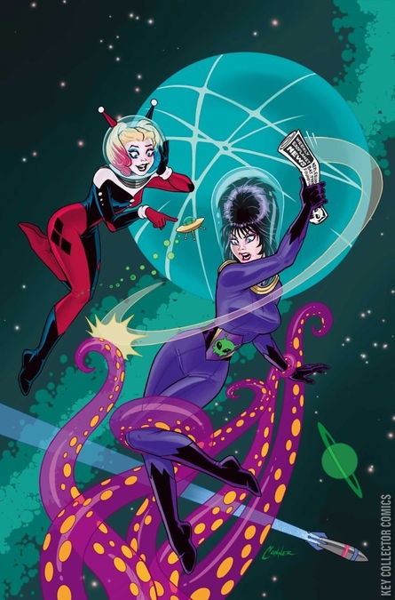 FROM CLASSIC CASTLES TO COSMIC CHAOS! After making a daring escape from their would-be captors in Transylvania, Elvira and Harley Quinn find themselves rocketing through space with the ever-dashing Vartox. Their destination? A jaw-dropping interspecies wedding in a galaxy far, far away. But when the ceremony spirals into madness and Elvira is abducted by a fanatical alien cult that worships her with drooling devotion… well, that’s when things start to get weird! The unfailingly down-to-Earth creative team of AMANDA CONNER and JIMMY PALMIOTTI reach for the stars in Harley Quinn X Elvira #5, with Conner delivering two complete covers (in addition to providing periodic panels for JUAN SAMU’s eye-pleasing interiors) alongside equally exciting entries from JOSEPH MICHAEL LINSNER, CHAD HARDIN, BEN CALDWELL, and a special MYSTERY BLIND BAG featuring exclusive variants! Please Note: The number of Blind Bags is limited, and allocations may occur.